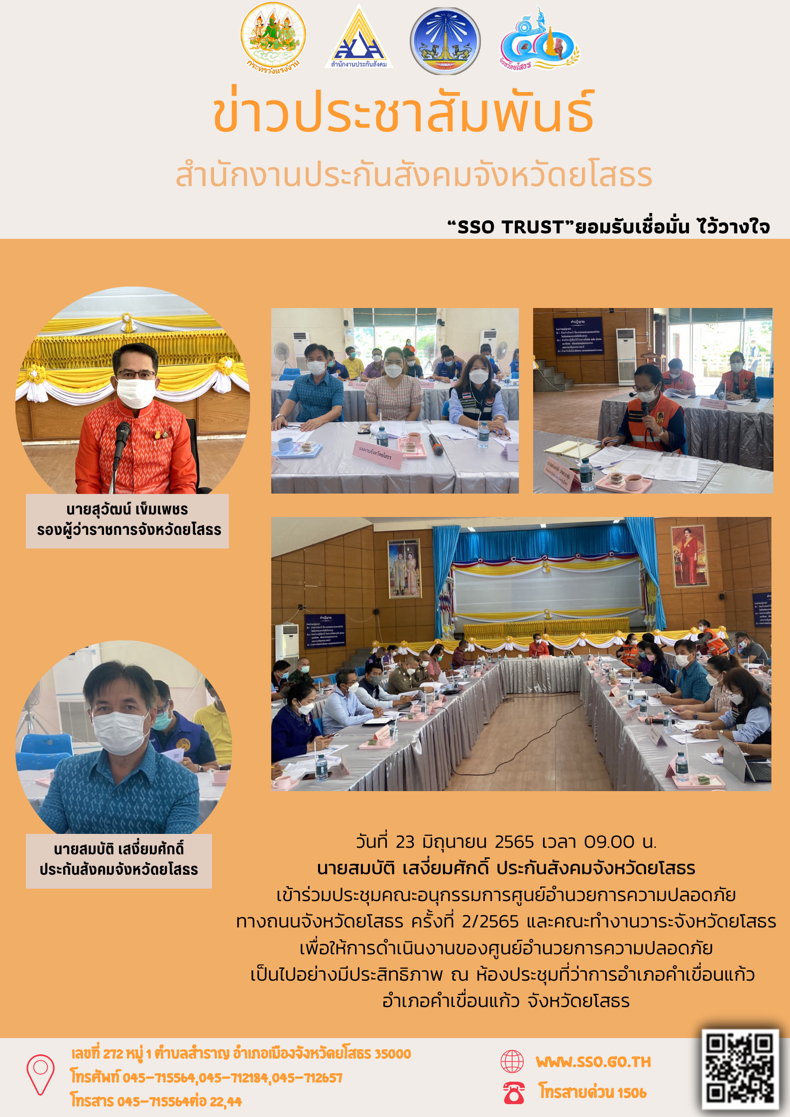 วันที่ 23 มิถุนายน 2565 เวลา 09.00 น. นายสมบัติ เสงี่ยมศักดิ์ ประกันสังคมจังหวัดยโสธร เข้าร่วมประชุมคณะอนุกรรมการศูนย์อำนวยการความปลอดภัย ทางถนนจังหวัดยโสธร ครั้งที่ 2/2565