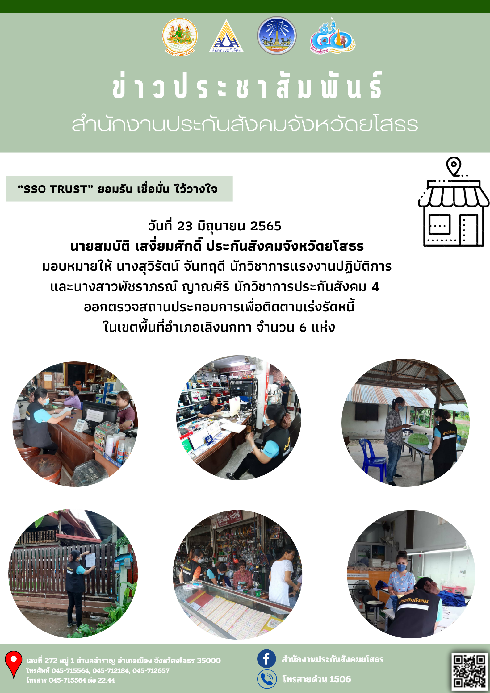 วันที่ 23 มิถุนายน 2565 นายสมบัติ เสงี่ยมศักดิ์ ประกันสังคมจังหวัดยโสธร มอบหมายให้ นางสุวิรัตน์ จันทฤดี นักวิชาการเเรงงานปฏิบัติการ และนางสาวพัชราภรณ์ ญาณศิริ นักวิชาการประกันสังคม 4 ออกตรวจสถานประกอบการเพื่อติดตามเร่งรัดหนี้