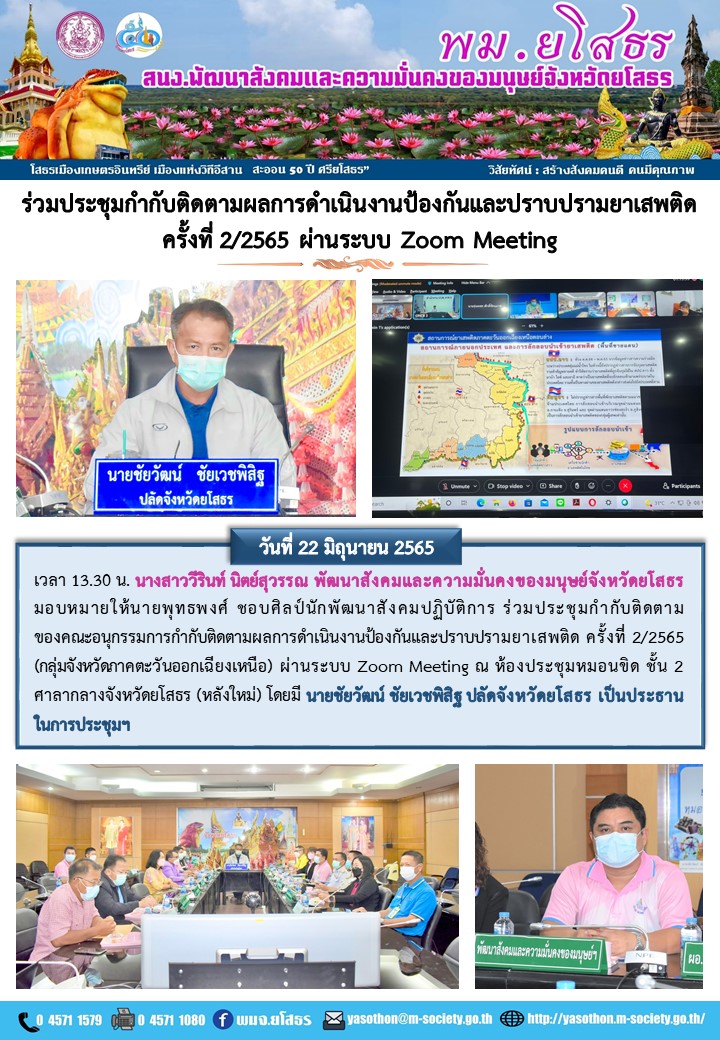 วันที่ 26 มิ.ย. 2565 (20:26 น.)วันที่ 22 มิถุนายน 2565 เวลา 13.30 น. นางสาววีรินท์ นิตย์สุวรรณ พัฒนาสังคมและความมั่นคงของมนุษย์จังหวัดยโสธร มอบหมายให้นายพุทธพงศ์ ชอบศิลป์นักพัฒนาสังคมปฏิบัติการ ร่วมประชุมกำกับติดตามของคณะอนุกรรมการกำกับติดตามผลการดำเนินงานป้องกันและปราบปรามยาเสพติด ครั้งที่ 2/2565 (กลุ่มจังหวัดภาคตะวันออกเฉียงเหนือ) ผ่านระบบ Zoom Meeting ณ ห้องประชุมหมอนขิด ชั้น 2 ศาลากลางจังหวัดยโสธร (หลังใหม่) โดยมี นายชัยวัฒน์ ชัยเวชพิสิฐ ปลัดจังหวัดยโสธร เป็นประธานในการประชุมฯ