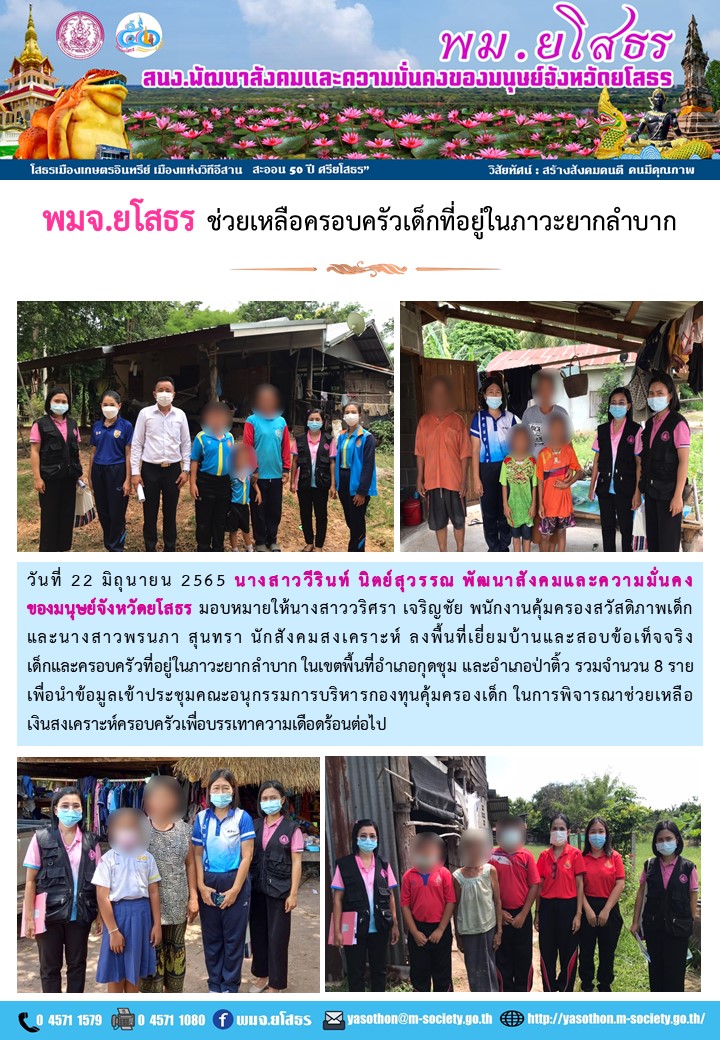 พมจ.ยโสธร ช่วยเหลือครอบครัวเด็กที่อยู่ในภาวะยากลำบาก (22 มิถุนายน 2565)