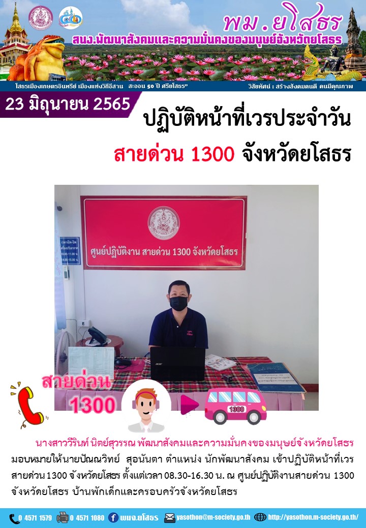 ปฏิบัติหน้าที่เวรประจำวันสายด่วน 1300 จังหวัดยโสธร (23 มิถุนายน 2565)