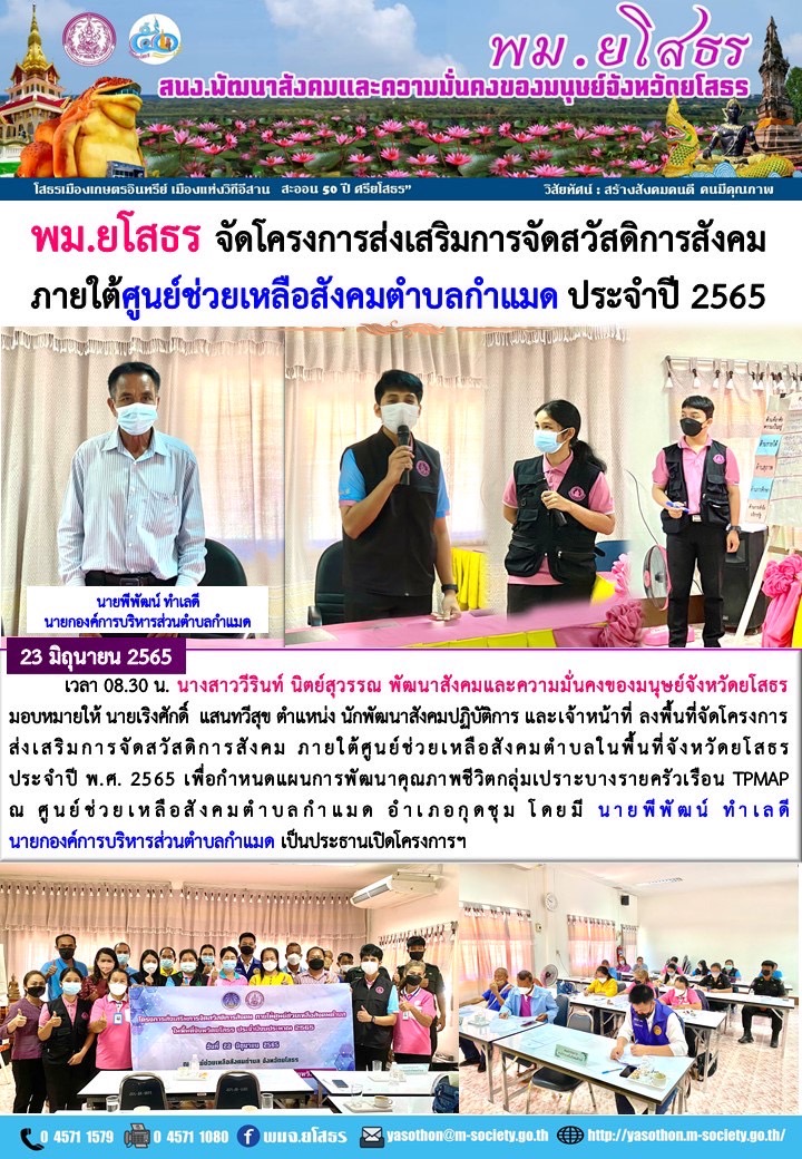พม.ยโสธร จัดโครงการส่งเสริมการจัดสวัสดิการสังคม ภายใต้ศูนย์ช่วยเหลือสังคมตำบลกำแมด ประจำปี พ.ศ. 2565 (23 มิถุนายน 2565)
