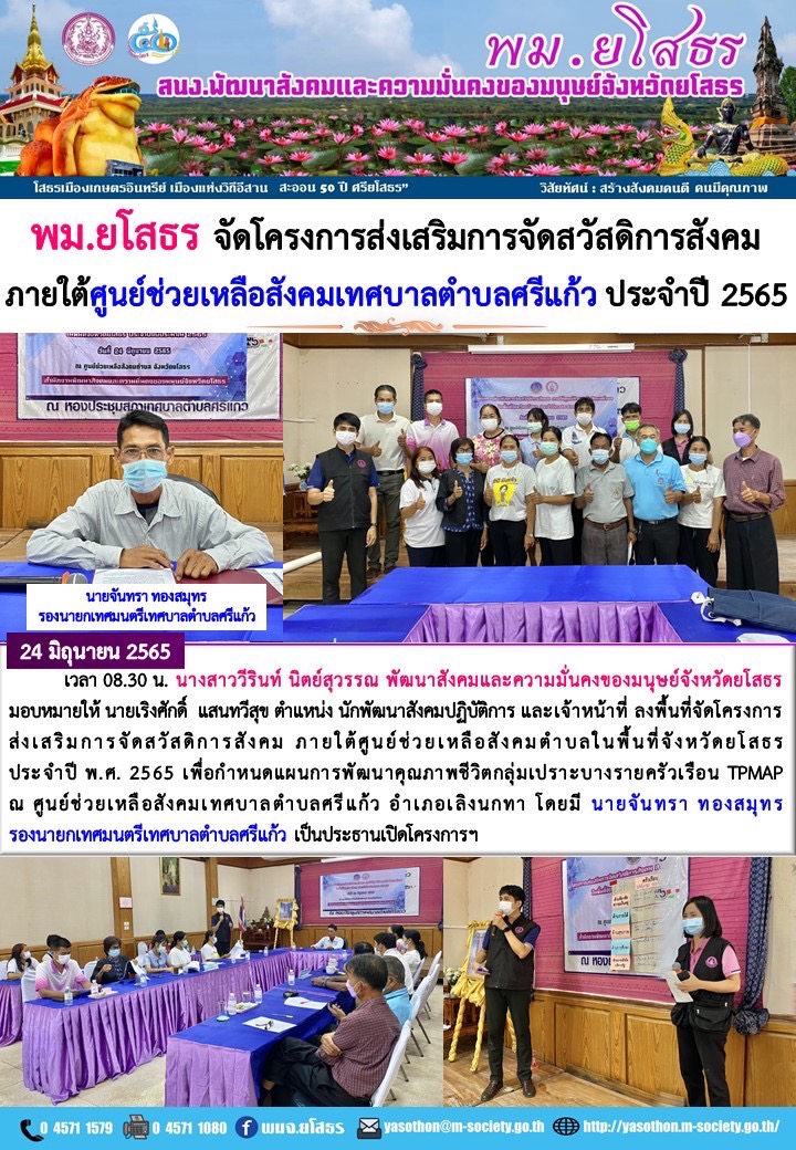 พม.ยโสธร จัดโครงการส่งเสริมการจัดสวัสดิการสังคม ภายใต้ศูนย์ช่วยเหลือสังคมตำบลศรีแก้ว ประจำปี พ.ศ. 2565 (24 มิถุนายน 2565)