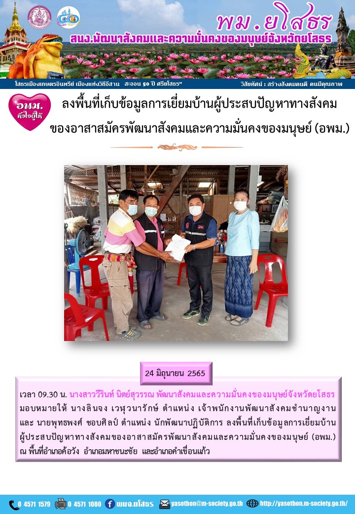 วันที่ 26 มิ.ย. 2565 (20:46 น.)วันที่ 24 มิถุนายน เวลา 09.30 น. นางสาววีรินท์ นิตย์สุวรรณ พัฒนาสังคมและความมั่นคงของมนุษย์จังหวัดยโสธร มอบหมายให้ นางลินจง เวฬุวนารักษ์ ตำแหน่ง เจ้าพนักงานพัฒนาสังคมชำนาญงาน และ นายพุทธพงศ์ ชอบศิลป์ ตำแหน่ง นักพัฒนาปฏิบัติการ ลงพื้นที่เก็บข้อมูลการเยี่ยมบ้าน ผู้ประสบปัญหาทางสังคมของอาสาสมัครพัฒนาสังคมและความมั่นคงของมนุษย์ (อพม.) ณ พื้นที่อำเภอค้อวัง อำเภอมหาชนะชัย และอำเภอคำเขื่อนแก้ว
