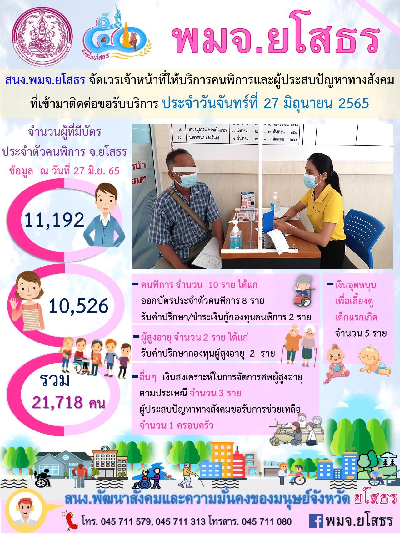 สนง.พมจ.ยโสธร จัดเวรเจ้าหน้าที่ให้บริการคนพิการและผู้ประสบปัญหาทางสังคม ที่เข้ามาติดต่อขอรับบริการ (27 มิถุนายน 2565)