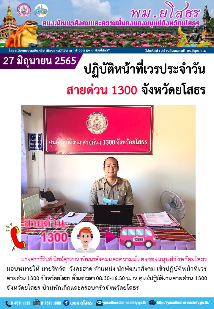 ปฏิบัติหน้าที่เวรประจำวันสายด่วน 1300 จังหวัดยโสธร (27 มิถุนายน 2565)