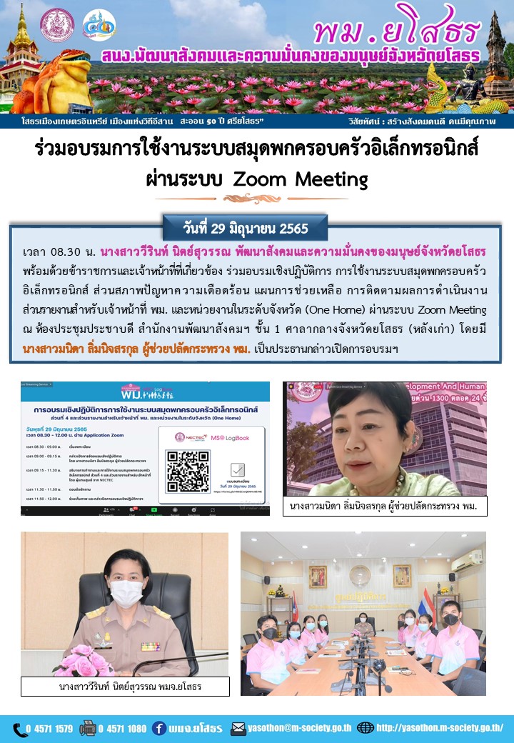 วันที่ 30 มิ.ย. 2565 (20:44 น.)วันที่ 29 มิถุนายน 2565 เวลา 08.30 น. นางสาววีรินท์ นิตย์สุวรรณ พัฒนาสังคมและความมั่นคงของมนุษย์จังหวัดยโสธร พร้อมด้วยข้าราชการและเจ้าหน้าที่ที่เกี่ยวข้อง ร่วมอบรมเชิงปฏิบัติการ การใช้งานระบบสมุดพกครอบครัวอิเล็กทรอนิกส์ ส่วนสภาพปัญหาความเดือดร้อน แผนการช่วยเหลือ การติดตามผลการดำเนินงาน ส่วนรายงานสำหรับเจ้าหน้าที่ พม. และหน่วยงานในระดับจังหวัด (One Home) ผ่านระบบ Zoom Meeting ณ ห้องประชุมประชาบดี สำนักงานพัฒนาสังคมฯ ชั้น 1 ศาลากลางจังหวัดยโสธร (หลังเก่า) โดยมี นางสาวมนิดา ลิ่มนิจสรกุล ผู้ช่วยปลัดกระทรวง พม. เป็นประธานกล่าวเปิดการอบรมฯ