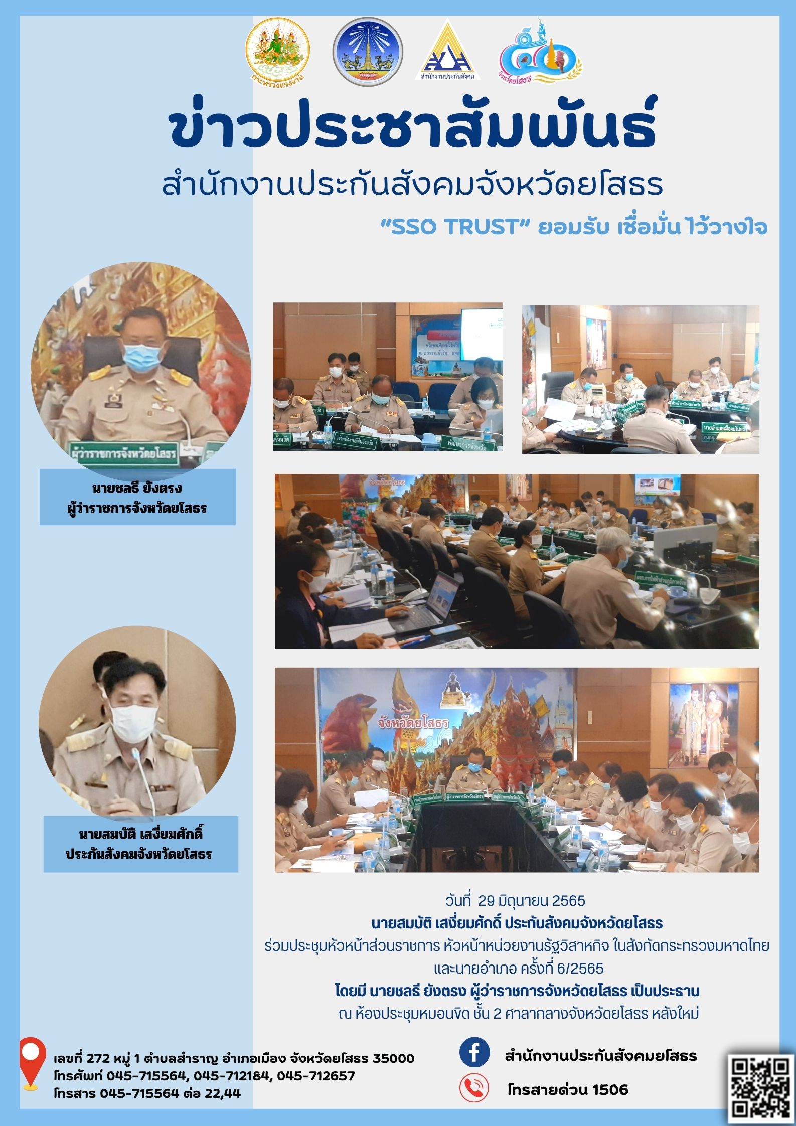 29 มิ.ย. 2565 นายสมบัติ เสงี่ยมศักดิ์ ประกันสังคมจังหวัดยโสธร ร่วมประชุมหัวหน้าส่วนราชการประจำจังหวัดยโสธร ครั้งที่ 6/2565
