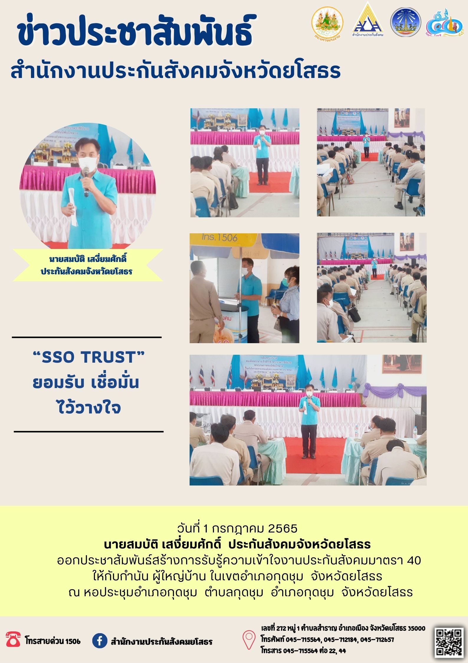 1 ก.ค. 2565 นายสมบัติ เสงี่ยมศักดิ์ ประกันสังคมจังหวัดยโสธร ออกประชาสัมพันธ์สร้างการรับรู้ความเข้าใจงานประกันสังคมมาตรา 40