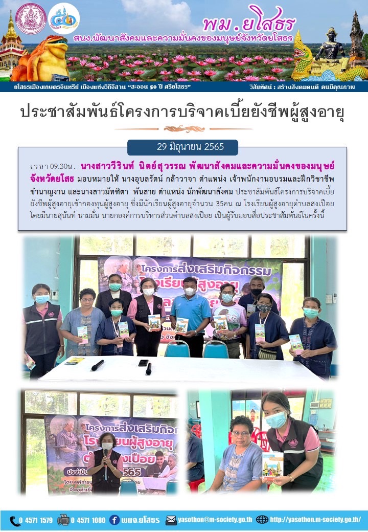 วันที่ 4 ก.ค. 2565 (20:34 น.)วันที่ 29 มิถุนายน 2565 เวลา09.30น. นางสาววีรินท์ นิตย์สุวรรณ พัฒนาสังคมและความมั่นคงของมนุษย์ จังหวัดยโสธ มอบหมายให้ นางอุบลรัตน์ กล้าวาจา ตำแหน่ง เจ้าพนักงานอบรมและฝึกวิชาชีพ ชำนาญงาน และนางสาวมัทฑิตา พันสาย ตำแหน่ง นักพัฒนาสังคม ประชาสัมพันธ์โครงการบริจาคเบี้ยยังชีพผู้สูงอายุเข้ากองทุนผู้สูงอายุ ซึ่งมีนักเรียนผู้สูงอายุจำนวน 35คน ณ โรงเรียนผู้สูงอายุตำบลสงเปือย โดยมีนายสุนันท์ นามมั่น นายกองค์การบริหารส่วนตำบลสงเปือย เป็นผู้รับมอบสื่อประชาสัมพันธ์ในครั้งนี้