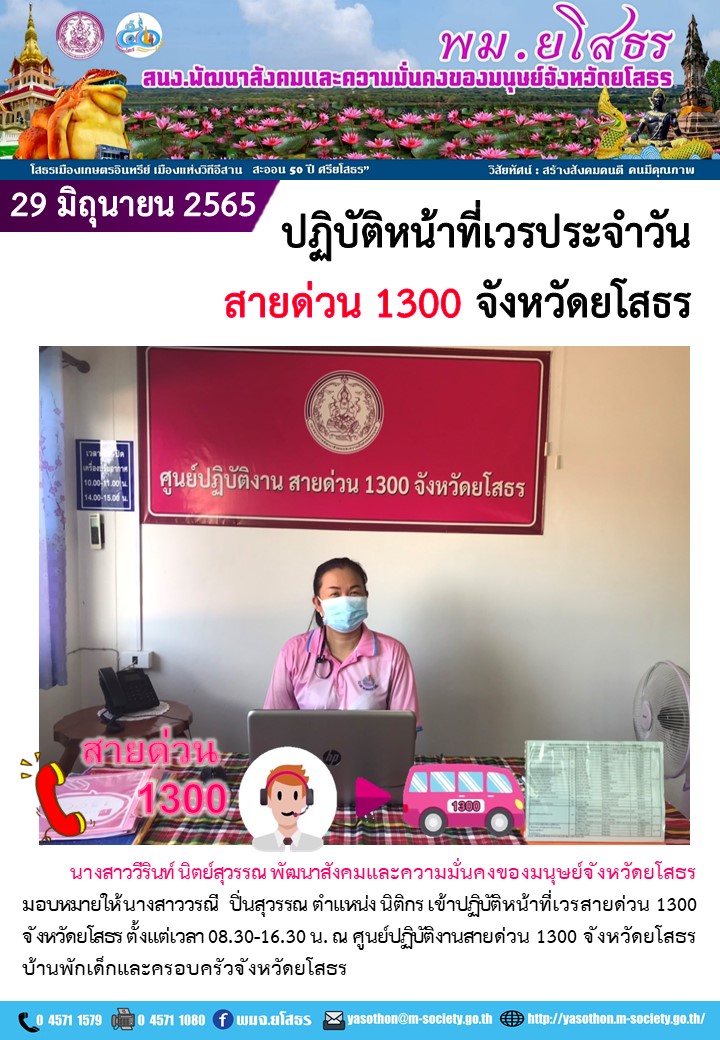 ปฏิบัติหน้าที่เวรประจำวันสายด่วน 1300 จังหวัดยโสธร (29 มิถุนายน 2565)