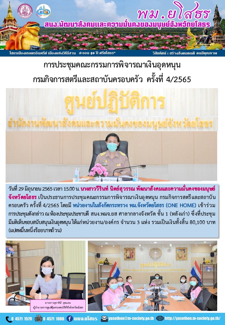 วันที่ 4 ก.ค. 2565 (20:38 น.)วันที่ 29 มิถุนายน 2565 เวลา 15.00 น. นางสาววีรินท์ นิตย์สุวรรณ พัฒนาสังคมและความมั่นคงของมนุษย์จังหวัดยโสธร เป็นประธานการประชุมคณะกรรมการพิจารณาเงินอุดหนุนกรมกิจการสตรี และสถาบันครอบครัว ครั้งที่ 4/2565 โดยมี หน่วยงานในสังกัดกระทรวง พม.จังหวัดย์โสธร (ONE HOME) เข้าร่วมการประชุมดังกล่าว ณ ห้องประชุมประขาบดี สนง.พมจ.ยส ศาลากลางจังหวัด ชั้น 1 (หลังเก่า) ซึ่งที่ประชุมมีมติเห็นขอบสนับสนุนงินอุตหนุนให้แก่หน่วยงาน/องค์กร จำนวน 3 แห่ง รวมเป็นเงินทั้งสิ้น 80,100 บาท(แปดหมื่นหนึ่งร้อยบาทถ้วน)
