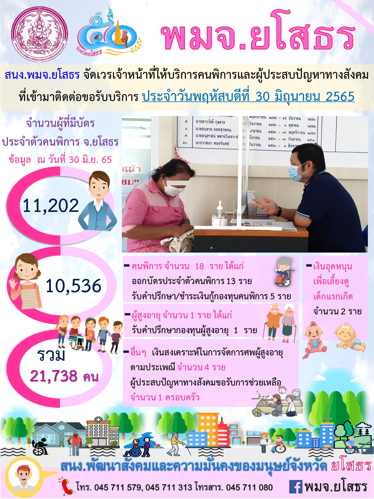 สนง.พมจ.ยโสธร จัดเวรเจ้าหน้าที่ให้บริการคนพิการและผู้ประสบปัญหาทางสังคม ที่เข้ามาติดต่อขอรับบริการ (30 มิถุนายน 2565)