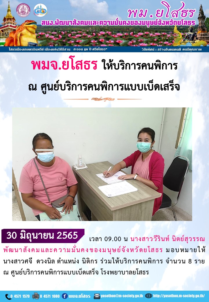 พมจ.ยโสธร ให้บริการคนพิการ ณ ศูนย์บริการคนพิการแบบเบ็ดเสร็จ (30 มิถุนายน 2565)