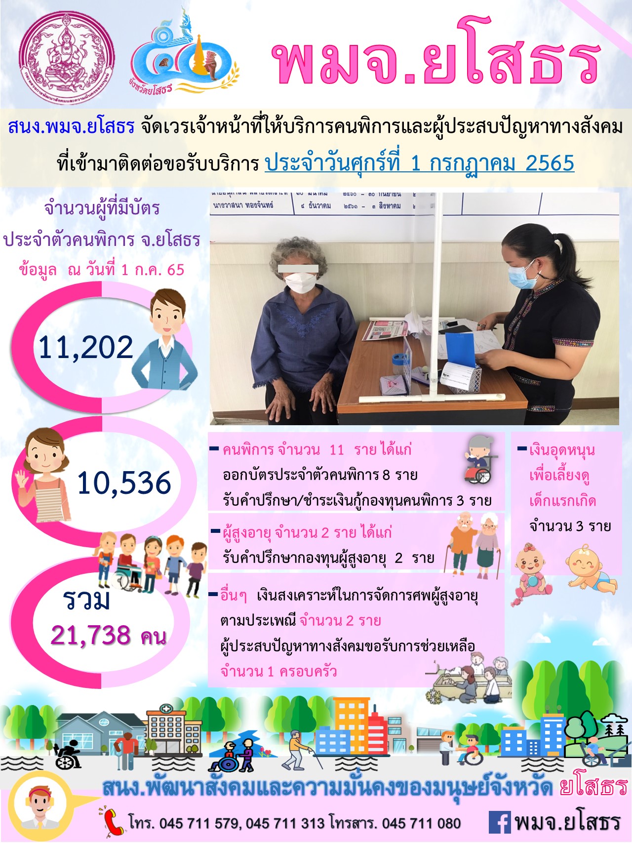 สนง.พมจ.ยโสธร จัดเวรเจ้าหน้าที่ให้บริการคนพิการและผู้ประสบปัญหาทางสังคม ที่เข้ามาติดต่อขอรับบริการ (1 กรกฎาคม 2565)