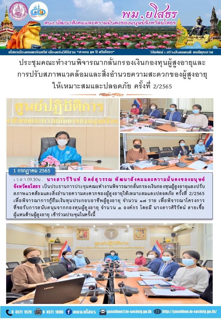 วันที่ 4 ก.ค. 2565 (21:02 น.)วันที่ 1 กรกฎาคม 2565 เวลา09.30น. นางสาววีรินท์ นิตย์สุวรรณ พัฒนาสังคมและความมั่นคงของมนุษย์จังหวัดยโสธร เป็นประธานการประชุมคณะทำงานพิจารณากลั่นกรองเงินกองทุนผู้สูงอายุและปรับสภาพแวดล้อมและสิ่งอำนวยความสะดวกของผู้สูงอายุให้เหมาะสมและปลอดภัย ครั้งที่ 2/2565 เพื่อพิจารณาการกู้ยืมเงินทุนประกอบอาชีพผู้สูงอายุ จำนวน ๑๗ ราย เพื่อพิจารณาโครงการที่ขอรับการสนับสนุนจากกองทุนผู้สูงอายุ จำนวน ๓ องค์กร โดยมี นางสาวศิริรัตน์ สายเชื้อ ผู้แทนด้านผู้สูงอายุ เข้าร่วมประชุมในครั้งนี้