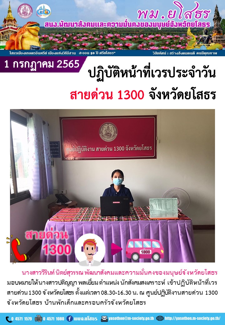 ปฏิบัติหน้าที่เวรประจำวันสายด่วน 1300 จังหวัดยโสธร (1 กรกฎาคม 2565)