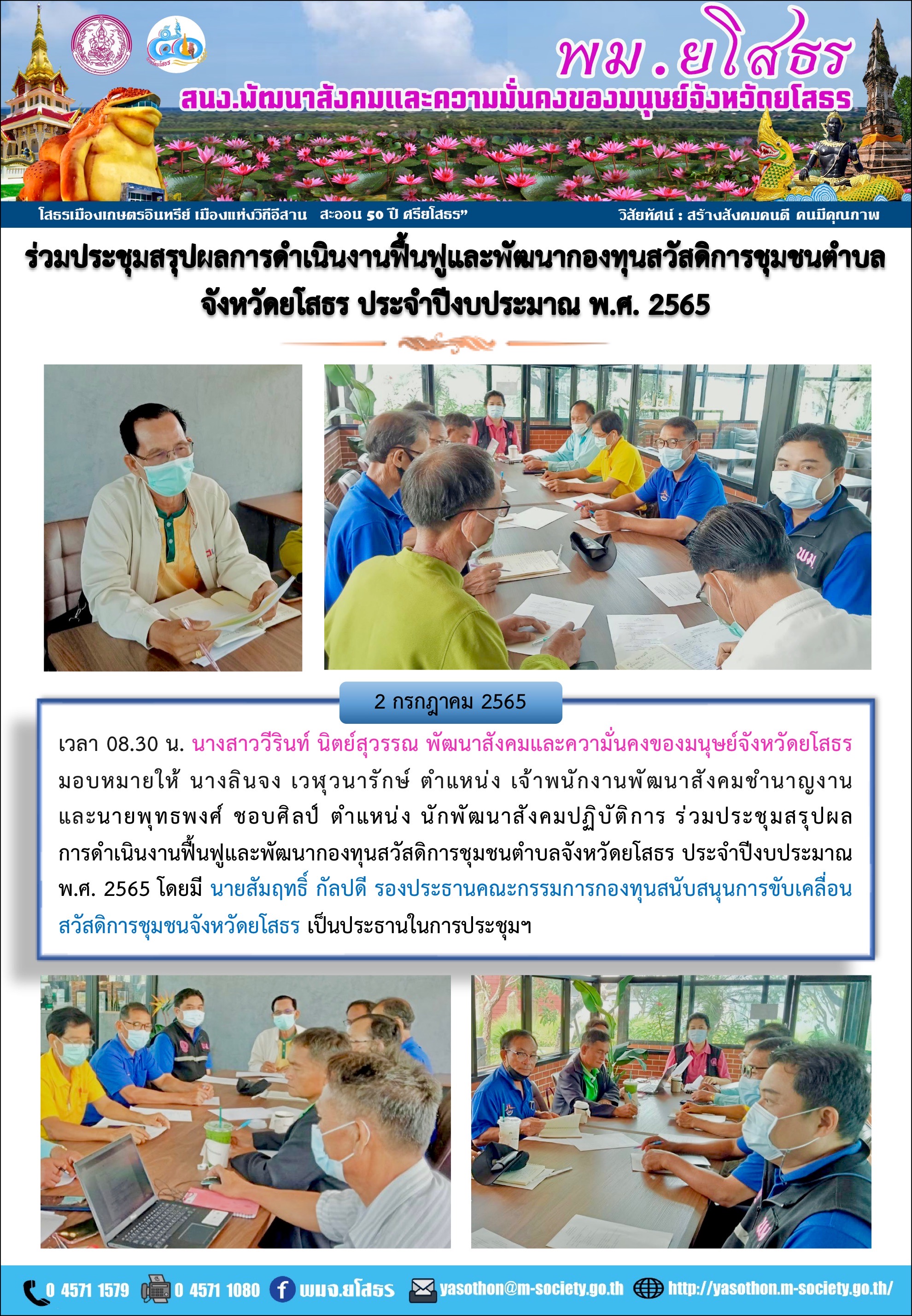 ร่วมประชุมสรุปผลการดำเนินงานฟื้นฟูและพัฒนากองทุนสวัสดิการชุมชนตำบลจังหวัดยโสธร ประจำปีงบประมาณ พ.ศ. 2565 (2 กรกฎาคม 2565)