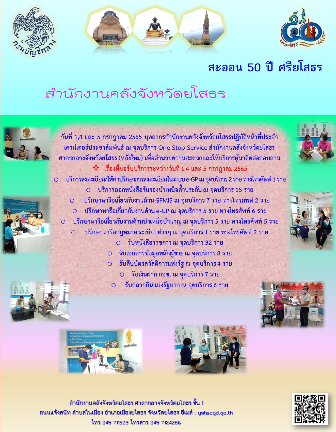 วันที่ 1,4 และ 5 กรกฎาคม 2565 บุคลากรสำนักงานคลังจังหวัดยโสธรปฏิบัติหน้าที่ประจำเคาน์เตอร์ประชาสัมพันธ์ ณ จุดบริการ One Stop Service สำนักงานคลังจังหวัดยโสธร ศาลากลางจังหวัดยโสธร (หลังใหม่) เพื่ออำนวยความสะดวกและให้บริการผู้มาติดต่อสอบถาม