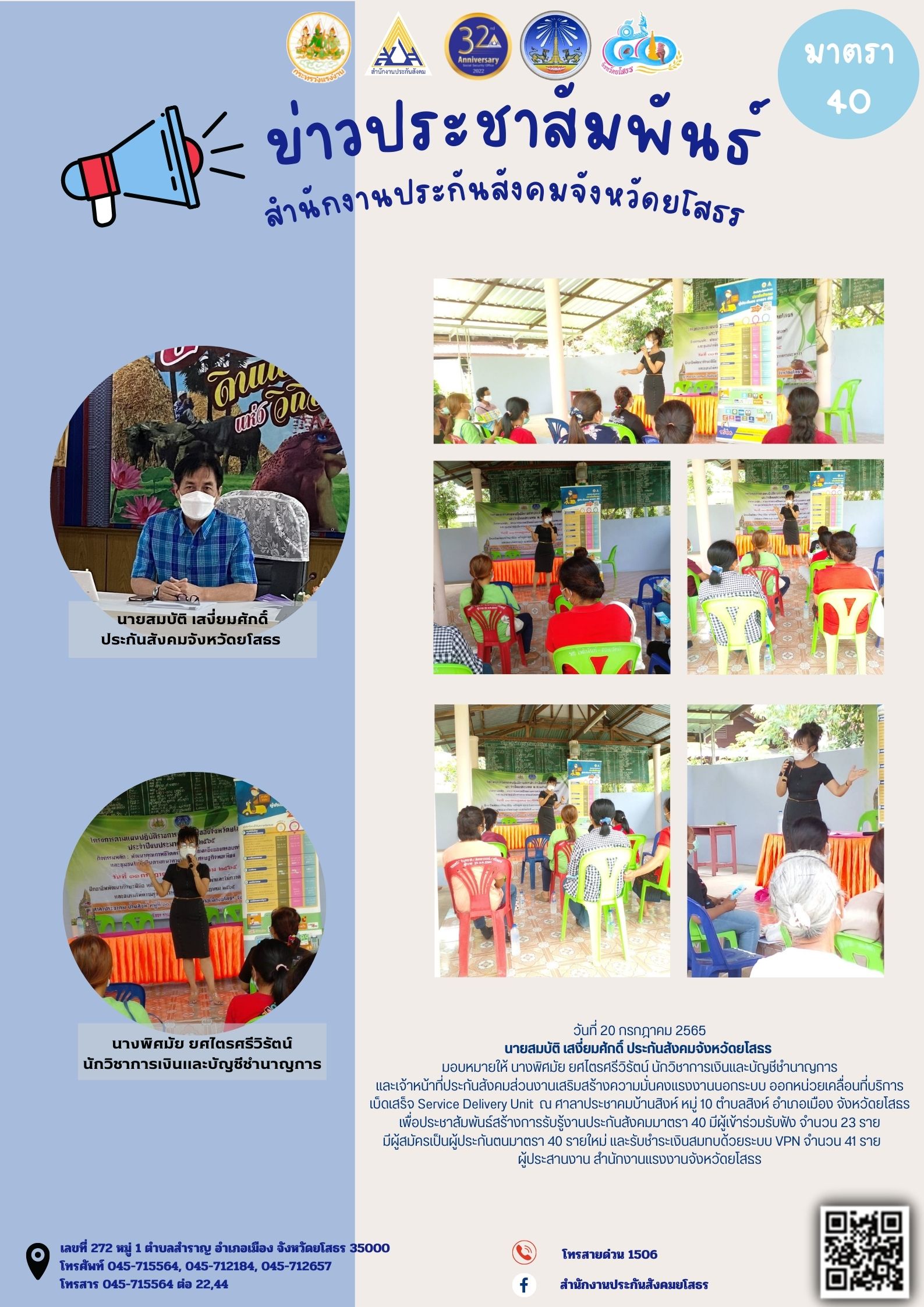วันที่ 20 กรกฎาคม 2565 นายสมบัติ เสงี่ยมศักดิ์ ประกันสังคมจังหวัดยโสธร มอบหมายให้ นางพิศมัย ยศไตรศรีวิรัตน์ นักวิชาการเงินและบัญชีชำนาญการ และเจ้าหน้าที่ประกันสังคมส่วนงานเสริมสร้างความมั่นคงแรงงานนอกระบบ ออกหน่วยเคลื่อนที่บริการเบ็ดเสร็จ Service