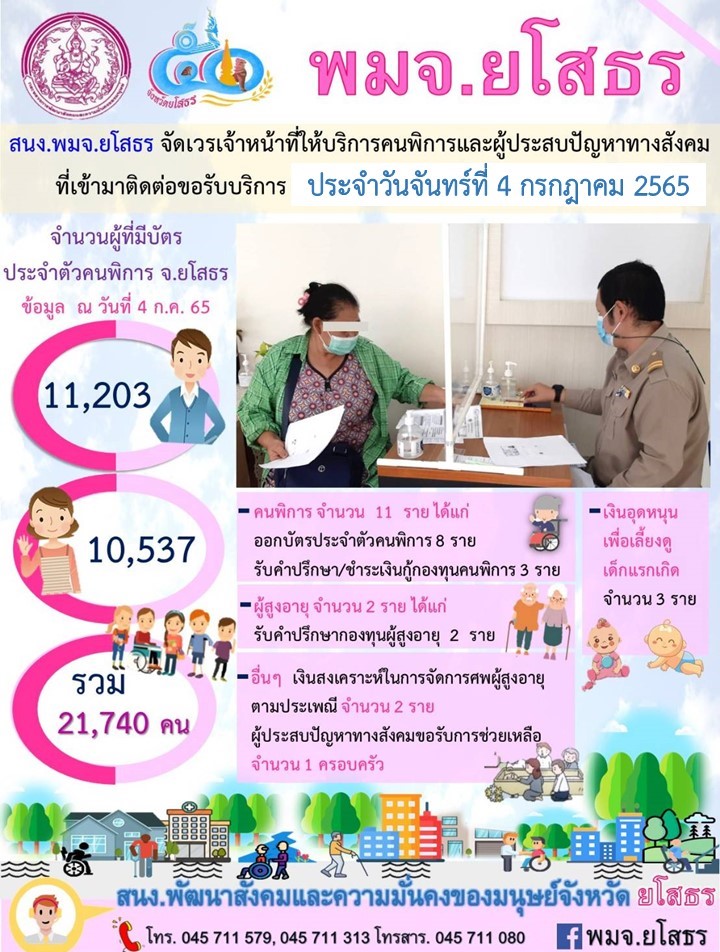 สนง.พมจ.ยโสธร จัดเวรเจ้าหน้าที่ให้บริการคนพิการและผู้ประสบปัญหาทางสังคม ที่เข้ามาติดต่อขอรับบริการ (4 กรกฎาคม 2565)