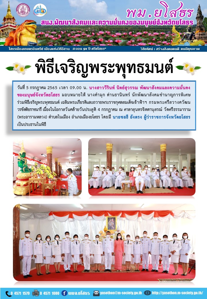 วันที่ 25 ก.ค. 2565 (09:22 น.)วันที่ 5 กรกฎาคม 2565 เวลา 09.00 น. นางสาววีรินท์ นิตย์สุวรรณ พัฒนาสังคมและความมั่นคงของมนุษย์จังหวัดยโสธร มอบหมายให้ นางคำมุก ด่านธานินทร์ นักพัฒนาสังคมชำนาญการพิเศษ ร่วมพิธีเจริญพระพุทธมนต์ เฉลิมพระเกียรติและถวายพระราชกุศลสมเด็จเจ้าฟ้าฯ กรมพระศรีสวางควัฒน วรขัตติยราชนารี เนื่องในโอกาสวันคล้ายวันประสูติ 4 กรกฏาคม ณ ศาลาสุนทรจิตตานุสรณ์ วัดศรีธรรมาราม (พระอารามหลวง) ตำบลในเมือง อำเภอเมืองยโสธร โดยมี นายชลธี ยังตรง ผู้ว่าราชการจังหวัดยโสธร เป็นประธานในพิธี