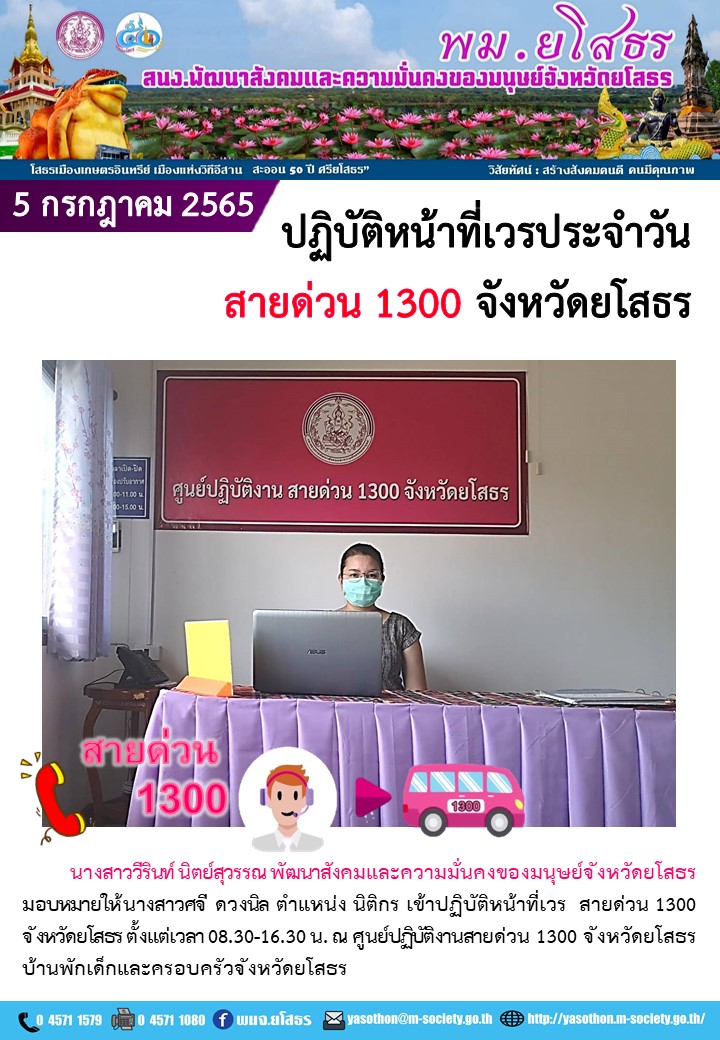 ปฏิบัติหน้าที่เวรประจำวันสายด่วน 1300 จังหวัดยโสธร (5 กรกฎาคม 2565)