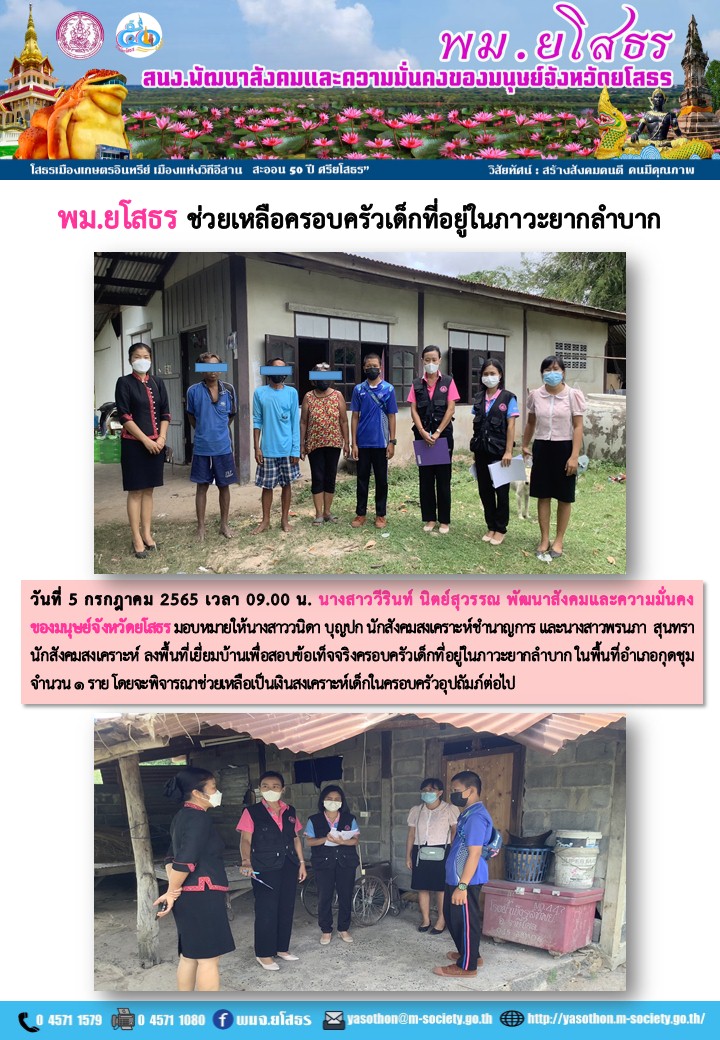 พม.ยโสธร ช่วยเหลือครอบครัวเด็กที่อยู่ในภาวะยากลำบาก (5 กรกฎาคม 2565)