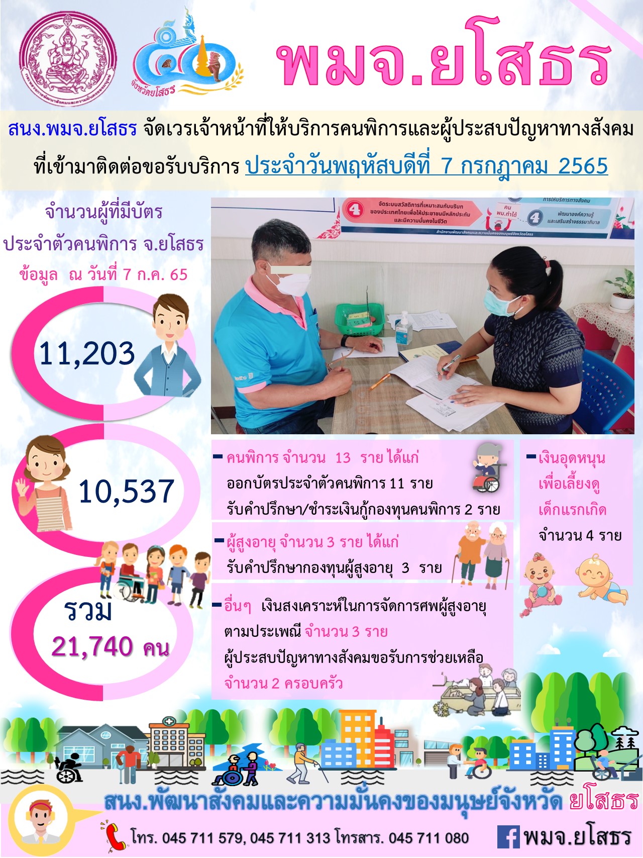 สนง.พมจ.ยโสธร จัดเวรเจ้าหน้าที่ให้บริการคนพิการและผู้ประสบปัญหาทางสังคม ที่เข้ามาติดต่อขอรับบริการ (7 กรกฎาคม 2565)