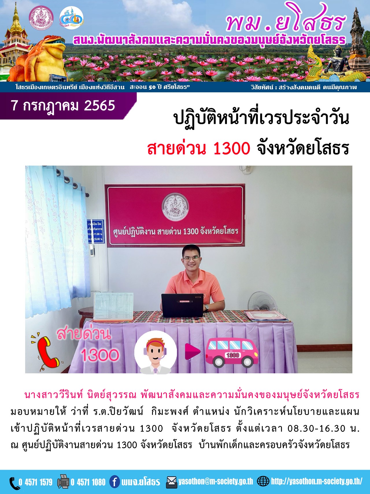 ปฏิบัติหน้าที่เวรประจำวันสายด่วน 1300 จังหวัดยโสธร (7 กรกฎาคม 2565)