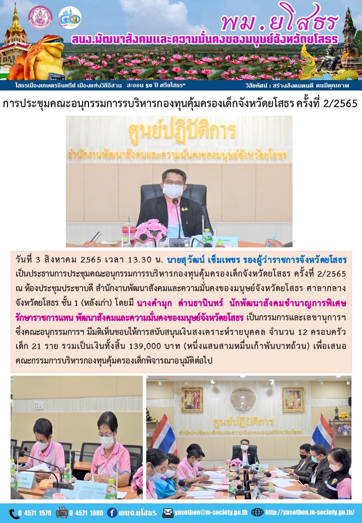 การประชุมคณะอนุกรรมการบริหารกองทุนคุ้มครองเด็กจังหวัดยโสธร ครั้งที่ 2/2565 (3 สิงหาคม 2565)