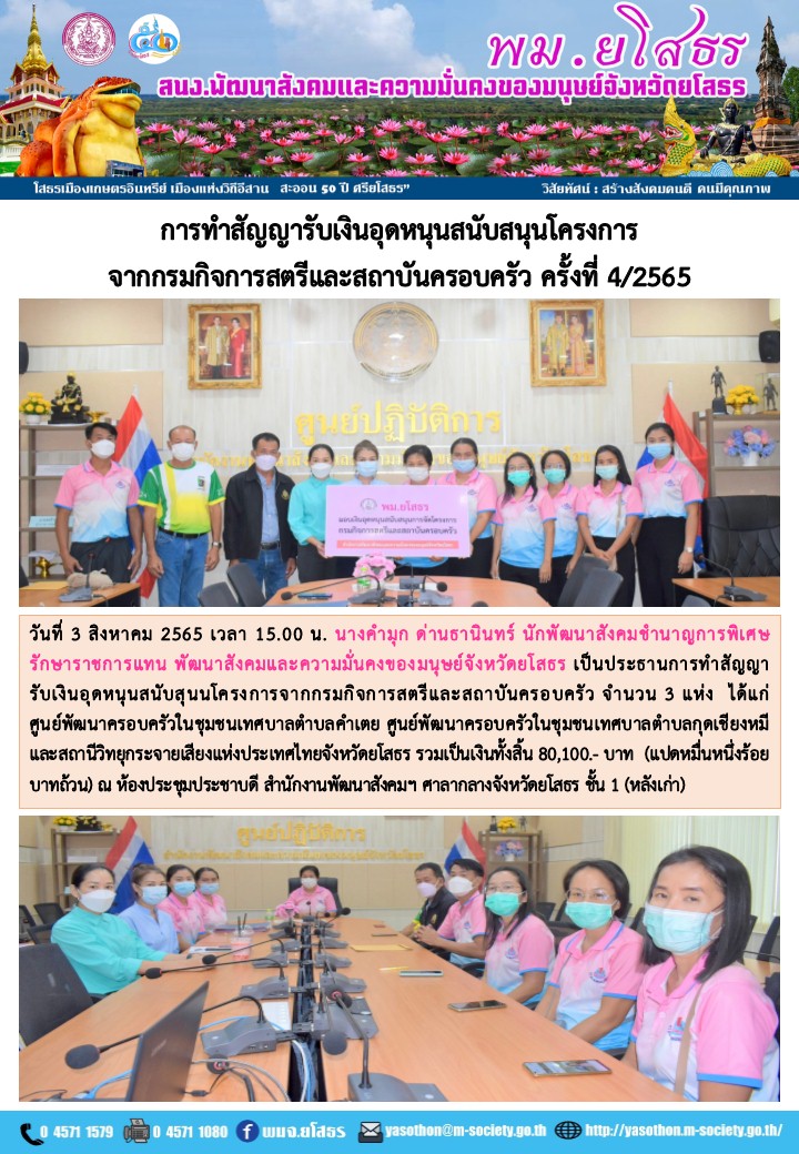 การทำสัญญารับเงินอุดหนุนสนับสนุนโครงการจากกรมกิจการสตรีและสถาบันครอบครัว ครั้งที่ 4/2565 (3 สิงหาคม 2565)