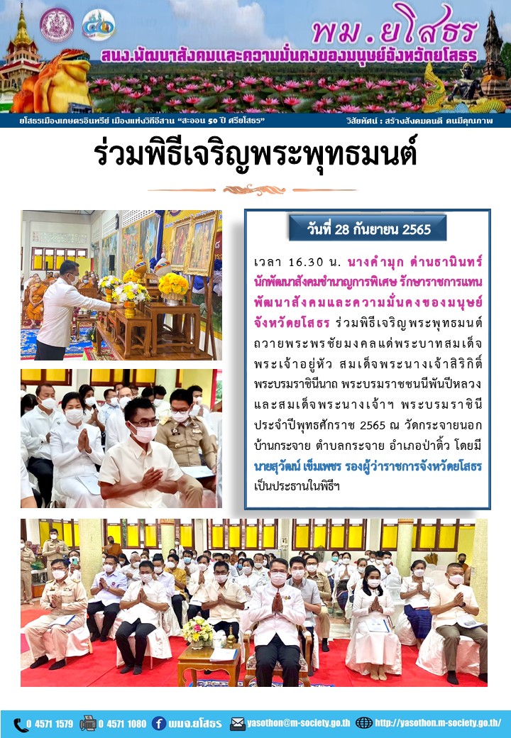 วันที่ 6 ต.ค. 2565 (15:22 น.)วันที่ 28 กันยายน 2565 เวลา 16.30 น. นางคำมุก ด่านธานินทร์ นักพัฒณาสังคมชำนาญการพิเศษ รักษาราชการแทนพัฒนาสังคมและความมั่นคงของมนุษย์จังหวัดยโสธร ร่วมพิธีเจริญพระพุทธมนต์ ถวายพระพรชัยมงคลแด่พระบาทสมเด็จพระเจ้าอยู่หัว สมเด็จพระนางเจ้าสิริกิติ์พระบรมราชินีนาถ พระบรมราชชนนีพันปีหลวงและสมเด็จพระนางเจ้าฯ พระบรมราชินี ประจำปีพุทธศักราช 2565 ณ วัดกระจายนอกบ้านกระจาย ตำบลกระจาย อำเภอป่าติ้ว โดยมี นายสุวัฒน์ เข็มเพชร รองผู้ว่าราชการจังหวัดยโสธร เป็นประธานในพิธีฯ
