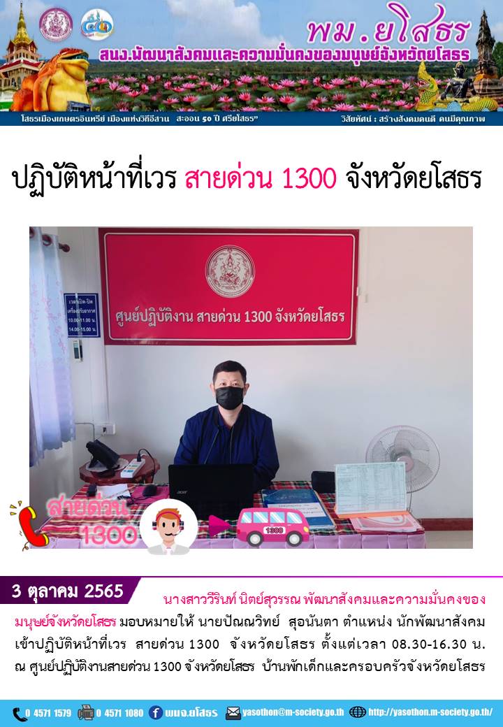 ปฏิบัติหน้าที่เวร สายด่วน 1300 จังหวัดยโสธร (3 ตุลาคม 2565)