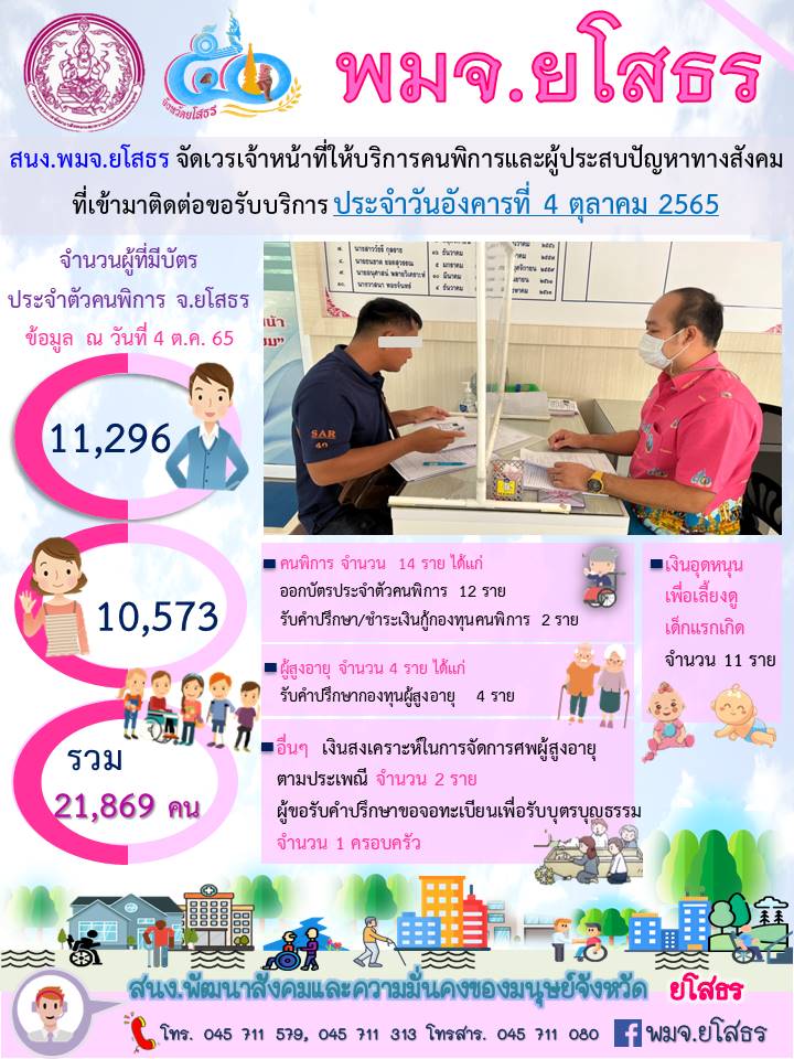 สนง.พมจ.ยโสธร จัดเวรเจ้าหน้าที่ให้บริการคนพิการและผู้ประสบปัญหาทางสังคม ที่เข้ามาติดต่อขอรับบริการ (4 ตุลาคม 2565)