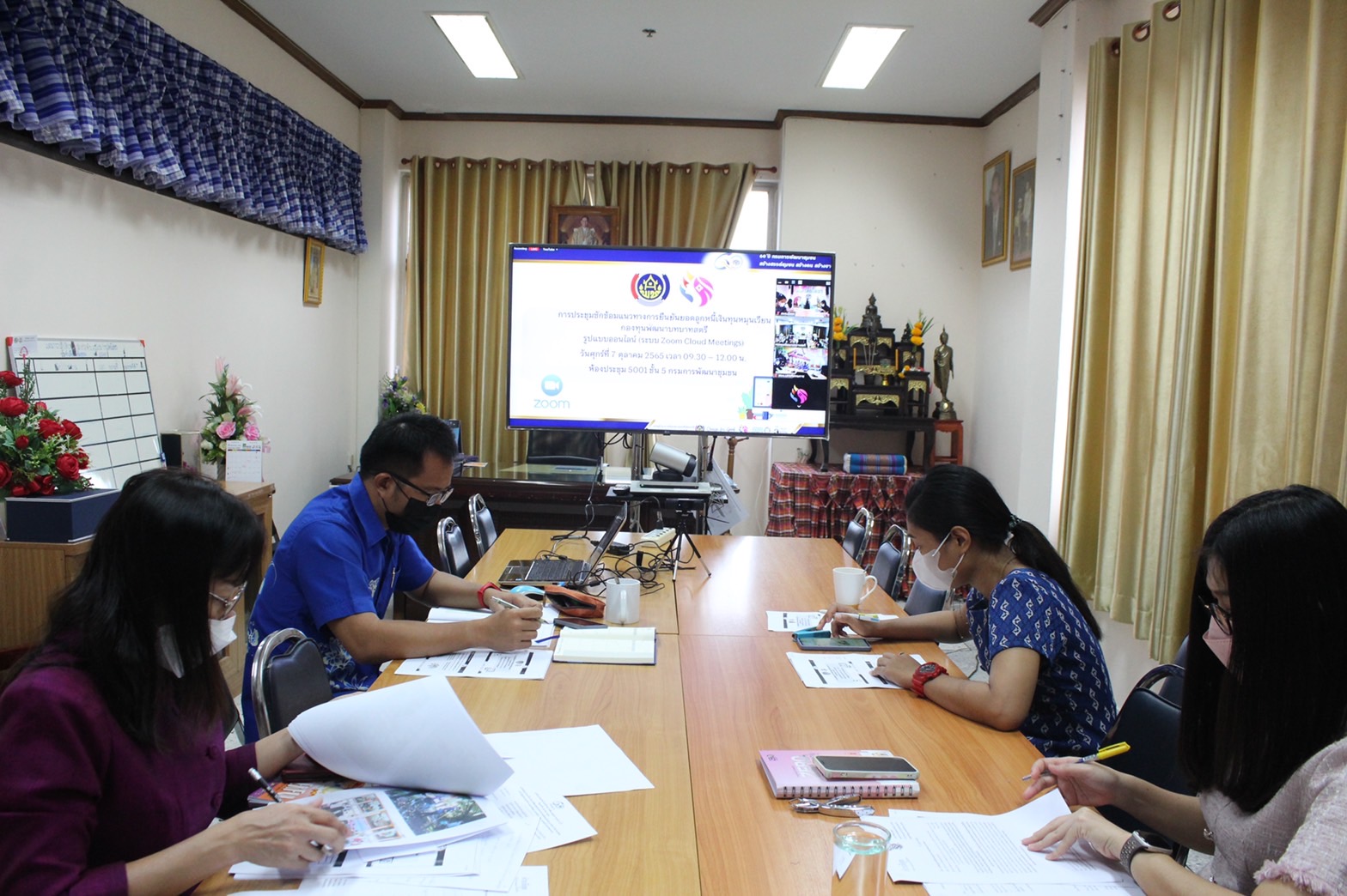 ผู้อำนวยการกลุ่มงานประสานและสนับสนุนการพัฒนาชุมชน พร้อมด้วย เจ้าหน้าที่พัฒนาชุมชนผู้รับผิดชอบงานกองทุนพัฒนาบทบาทสตรี ร่วมประชุม การยืนยันลูกหนี้เงินทุนหมุนเวียน กองทุนพัฒนาบทบาทสตรี ผ่านระบบออนไลน์ (Zoom cloud Meeting) เพื่อจัดทำรายงานการใช้เงินประจำบัญชีปี 2565 และตรวจสอบความมีอยู่จริงของเงินให้กู้ยืมของกองทุนพัฒนาบทบาทสตรี ณ วันที่ 30 กันยายน 2565 ให้เป็นไปด้วยความถูกต้องและเรียบร้อย โดยกรมการพัฒนาชุมชนได้จัดประชุมเพื่อซักซ้อมแนวทางในการจัดทำรายงานดังกล่าว