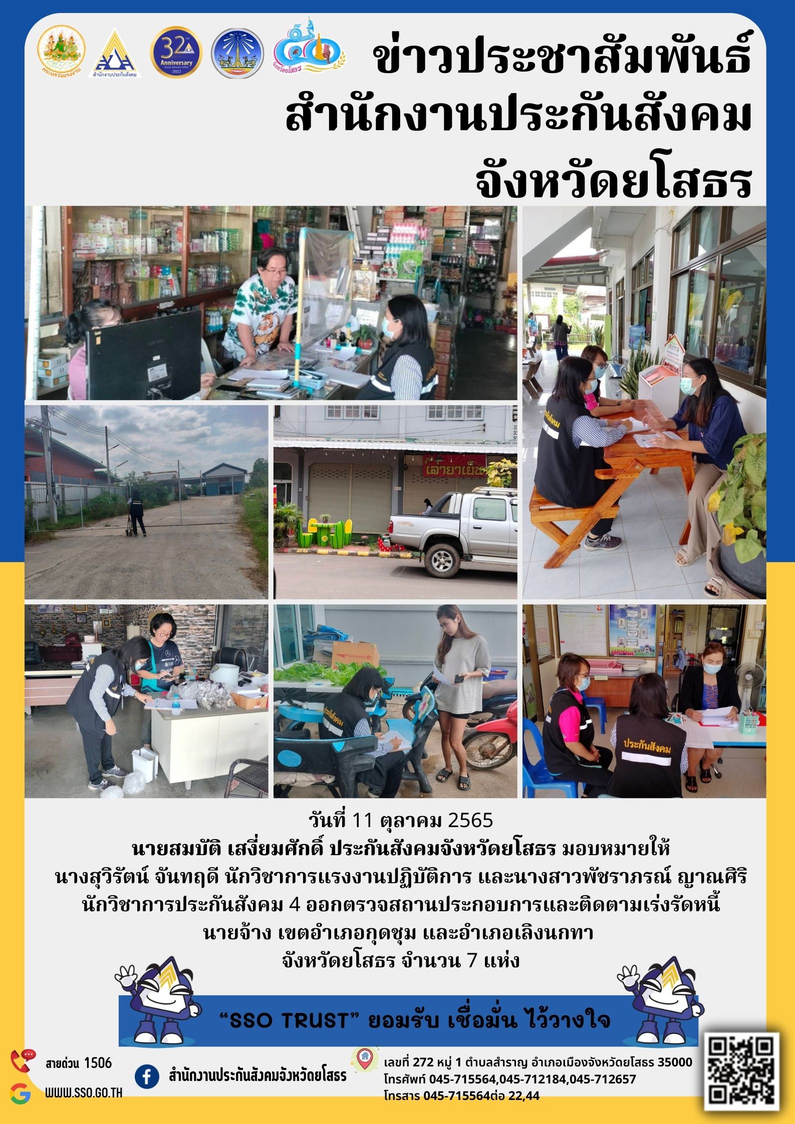 วันที่ 11 ตุลาคม 2565 นายสมบัติ เสงี่ยมศักดิ์ ประกันสังคมจังหวัดยโสธร มอบหมายให้ นางสุวิรัตน์ จันทฤดี นักวิชาการแรงงานปฏิบัติการ และนางสาวพัชราภรณ์ ญาณศิริ นักวิชาการประกันสังคม 4 ออกตรวจสถานประกอบการและติดตามเร่งรัดหนี้นายจ้าง เขตอำเภอกุดชุม และอำเภ
