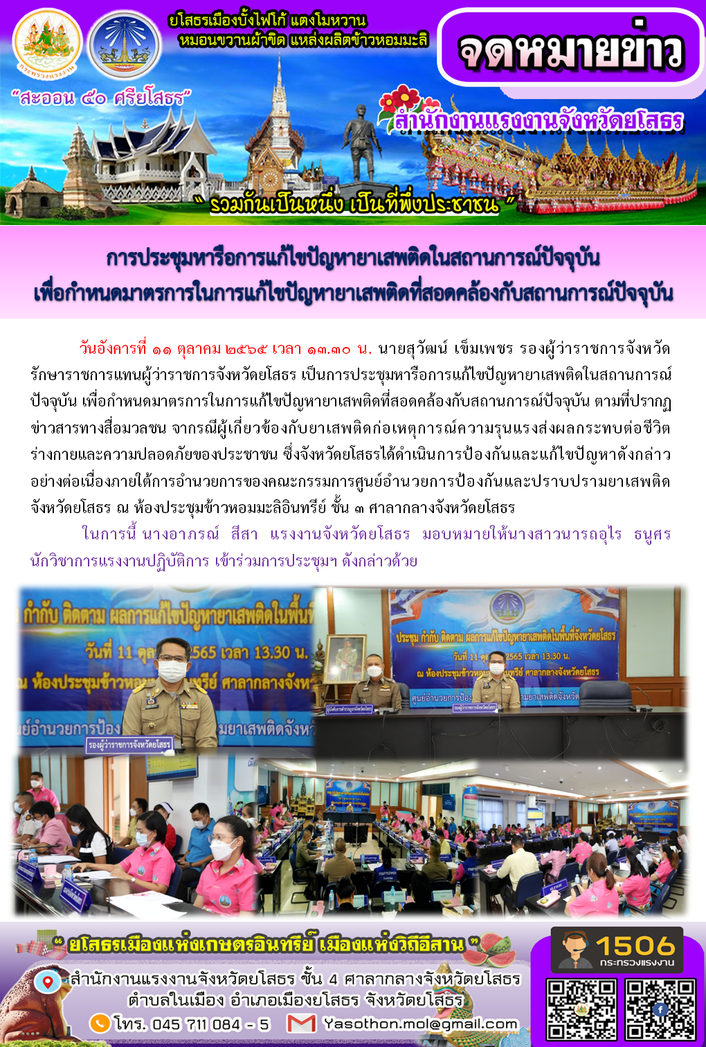 สำนักงานแรงงานจังหวัดยโสธร เข้าร่วมการประชุมหารือการแก้ไขปัญหายาเสพติดในสถานการณ์ปัจจุบัน เพื่อกำหนดมาตรการในการแก้ไขปัญหายาเสพติดที่สอดคล้องกับสถานการณ์ปัจจุบัน