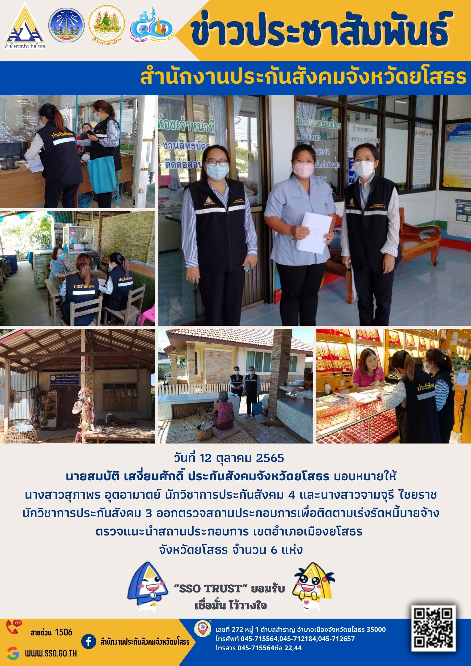 วันที่ 12 ตุลาคม 2565 นายสมบัติ เสงี่ยมศักดิ์ ประกันสังคมจังหวัดยโสธร มอบหมายให้ นางสาวสุภาพร อุตอามาตย์ นักวิชาการประกันสังคม 4 และนางสาวจามจุรี ไชยราช นักวิชาการประกันสังคม 3 ออกตรวจสถานประกอบการเพื่อติดตามเร่งรัดหนี้นายจ้าง ตรวจแนะนำสถานประกอบการ