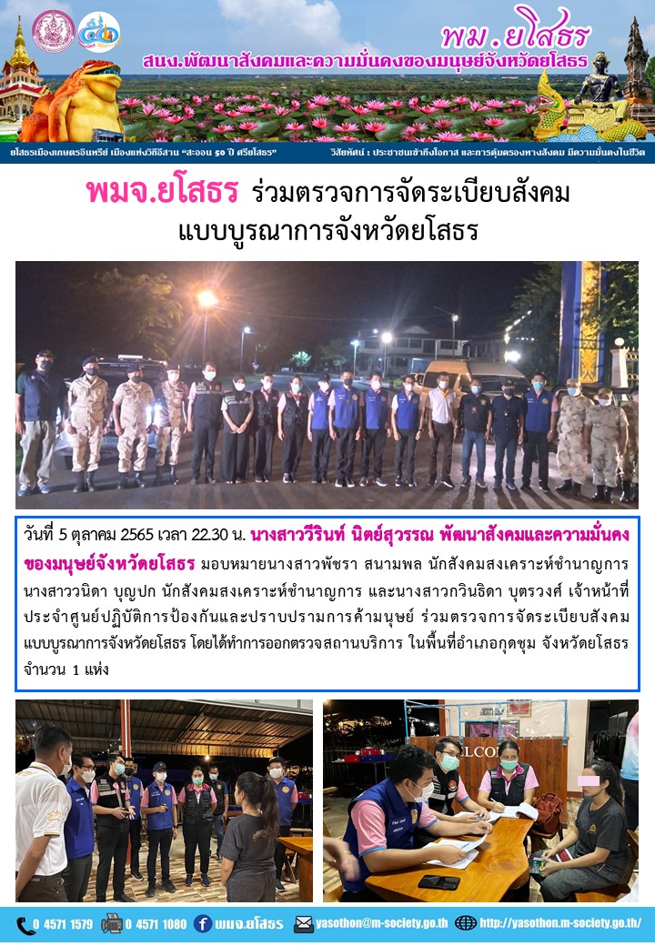 พมจ.ยโสธร ร่วมตรวจการจัดระเบียบสังคม แบบบูรณาการจังหวัดยโสธร โดยได้ทำการออกตรวจสถานบริการ (5 ตุลาคม 2565)