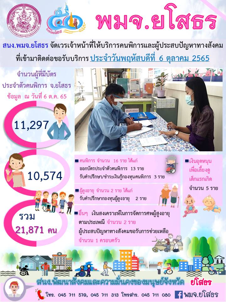 สนง.พมจ.ยโสธร จัดเวรเจ้าหน้าที่ให้บริการคนพิการและผู้ประสบปัญหาทางสังคม ที่เข้ามาติดต่อขอรับบริการ (6 ตุลาคม 2565)