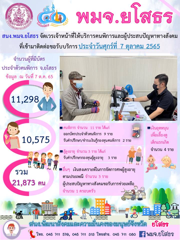 สนง.พมจ.ยโสธร จัดเวรเจ้าหน้าที่ให้บริการคนพิการและผู้ประสบปัญหาทางสังคม ที่เข้ามาติดต่อขอรับบริการ (7 ตุลาคม 2565)