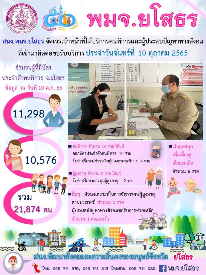 สนง.พมจ.ยโสธร จัดเวรเจ้าหน้าที่ให้บริการคนพิการและผู้ประสบปัญหาทางสังคม ที่เข้ามาติดต่อขอรับบริการ (10 ตุลาคม 2565)