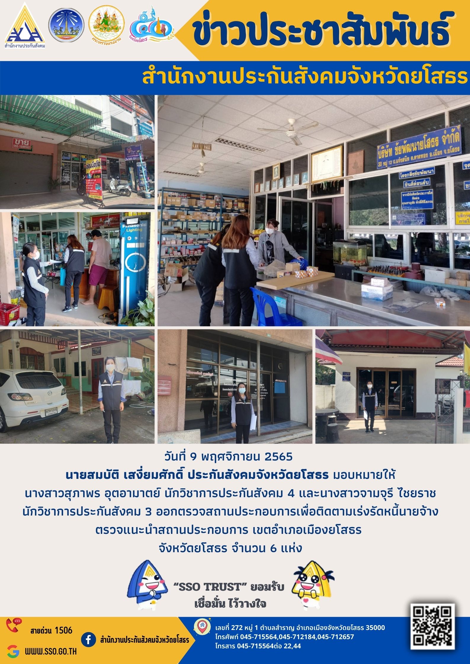 วันที่ 9 พฤศจิกายน 2565 นายสมบัติ เสงี่ยมศักดิ์ ประกันสังคมจังหวัดยโสธร มอบหมายให้ นางสาวสุภาพร อุตอามาตย์ นักวิชาการประกันสังคม 4 และนางสาวจามจุรี ไชยราช นักวิชาการประกันสังคม 3 ออกตรวจสถานประกอบการเพื่อติดตามเร่งรัดหนี้นายจ้าง ตรวจแนะนำสถานประกอบก