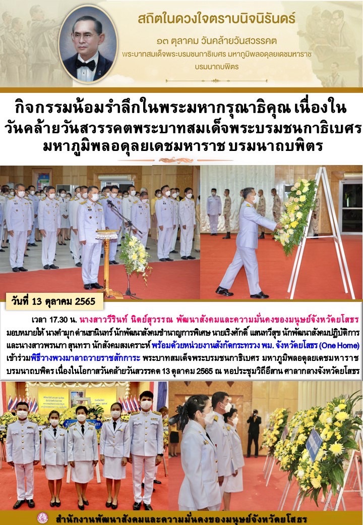 พม.ยโสธร ร่วมพิธีวางพวงมาลาถวายราชสักการะพระบาทสมเด็จพระบรมชนกาธิเบศร มหาภูมิพลอดุลยเดชมหาราชบรมนาถบพิตร (13 ตุลาคม 2565)
