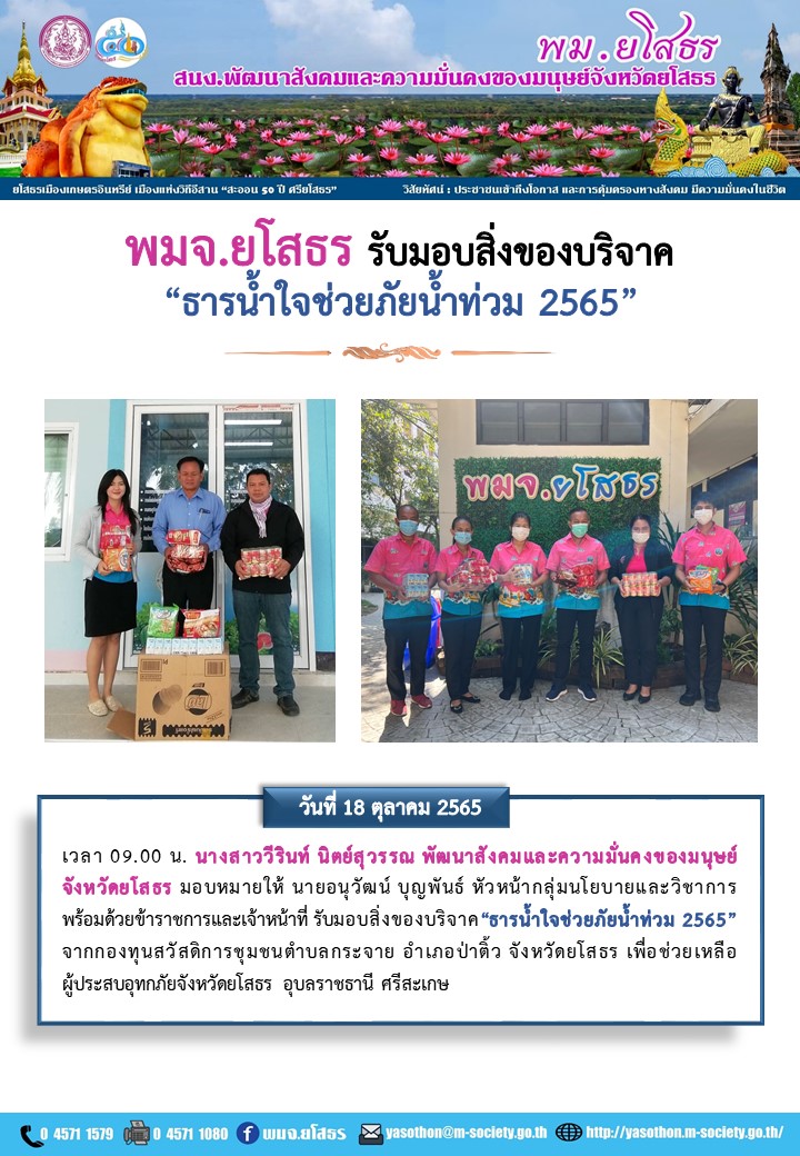 พมจ.ยโสธร รับมอบสิ่งของบริจาค“ธารน้ำใจช่วยภัยน้ำท่วม 2565” จากกองทุนสวัสดิการชุมชนตำบลกระจาย อำเภอป่าติ้ว จังหวัดยโสธร (18 ตุลาคม 2565)