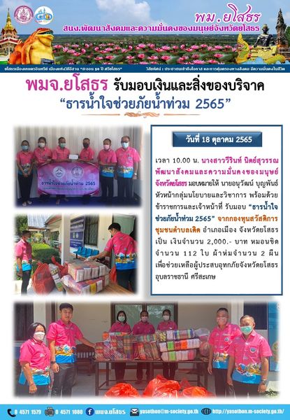พมจ.ยโสธร รับมอบ “ธารน้ำใจช่วยภัยน้ำท่วม 2565” จากกองทุนสวัสดิการชุมชนตำบลเดิด อำเภอเมือง จังหวัดยโสธร (18 ตุลาคม 2565)