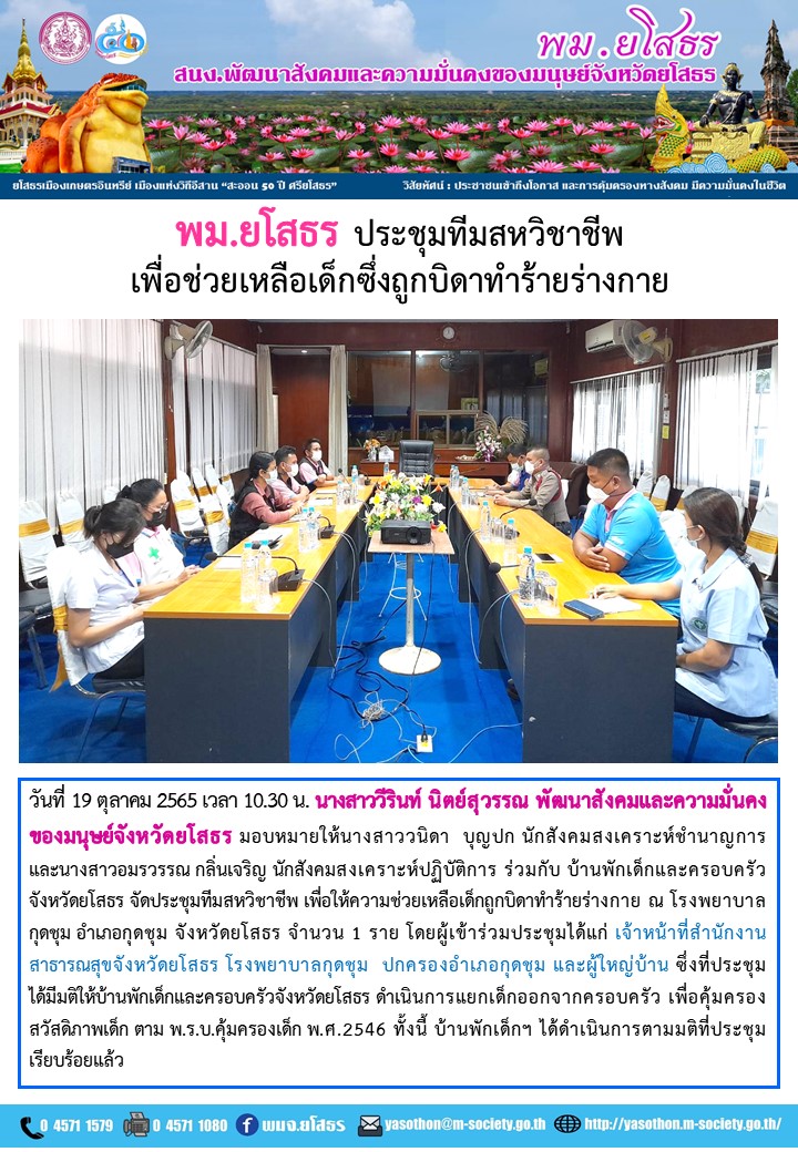 พม.ยโสธร ประชุมทีมสหวิชาชีพ เพื่อให้ความช่วยเหลือเด็กถูกบิดาทำร้ายร่างกาย (19 ตุลาคม 2565)