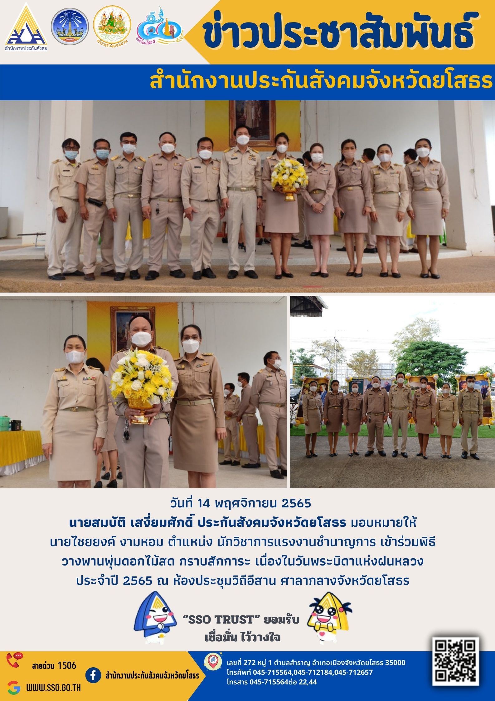 วันที่ 14 พฤศจิกายน 2565 นายสมบัติ เสงี่ยมศักดิ์ ประกันสังคมจังหวัดยโสธร มอบหมายให้ นายไชยยงค์ งามหอม ตำแหน่ง นักวิชาการแรงงานชำนาญการ เข้าร่วมพิธี วางพานพุ่มดอกไม้สด กราบสักการะ เนื่องในวันพระบิดาแห่งฝนหลวง ประจำปี 2565 ณ ห้องประชุมวิถีอีสาน ศาลากล