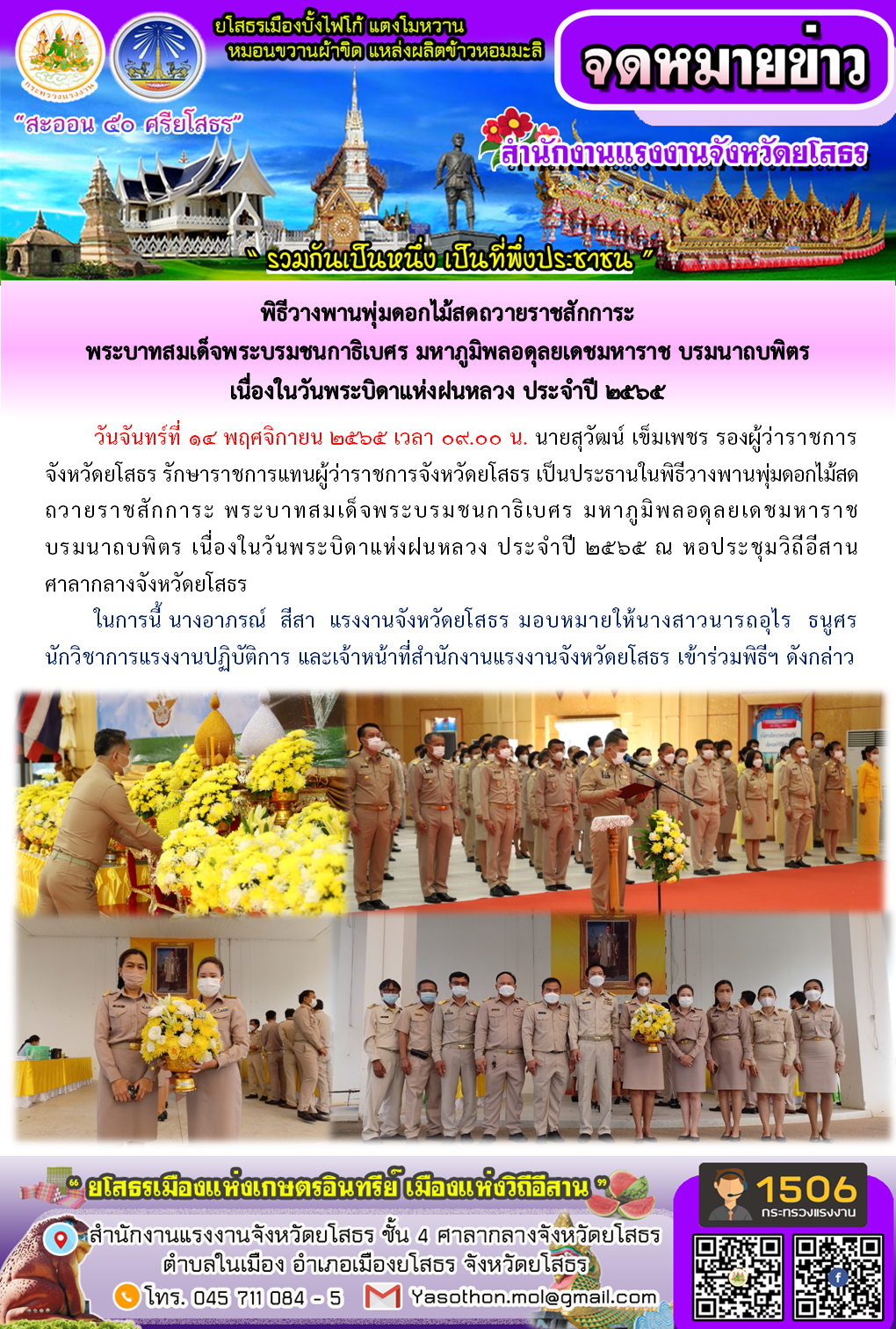 สำนักงานแรงงานจังหวัดยโสธร เข้าร่วมพิธีวางพานพุ่มดอกไม้สดถวายราชสักการะ พระบาทสมเด็จพระบรมชนกาธิเบศร มหาภูมิพลอดุลยเดชมหาราช บรมนาถบพิตร เนื่องในวันพระบิดาแห่งฝนหลวง ประจำปี 2565